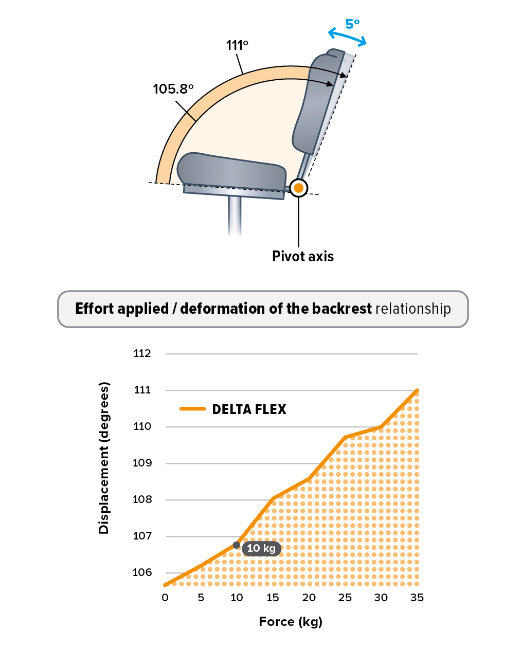 We call DELTA FLEX the joint between seat and backrest. With a static opening angle of 108º, it is built to respond to force