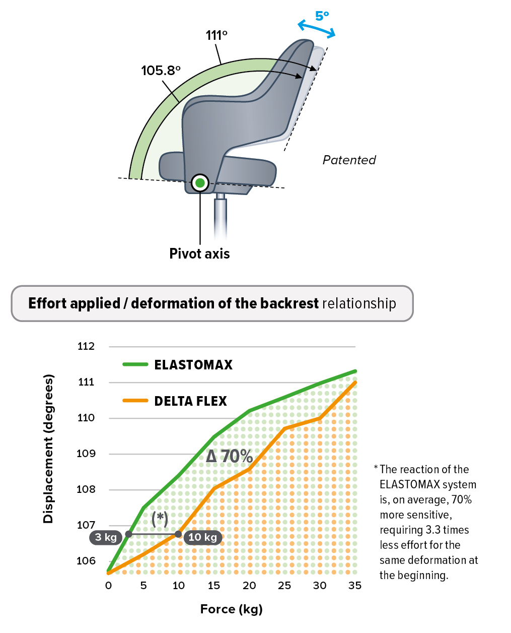 The force on the backrest exerts an “lever arm” that, combined with the characteristics of the elastomer, improves the effectiveness of the system, being 70% more “adaptable” and 3 times more “sensitive” at the outset.